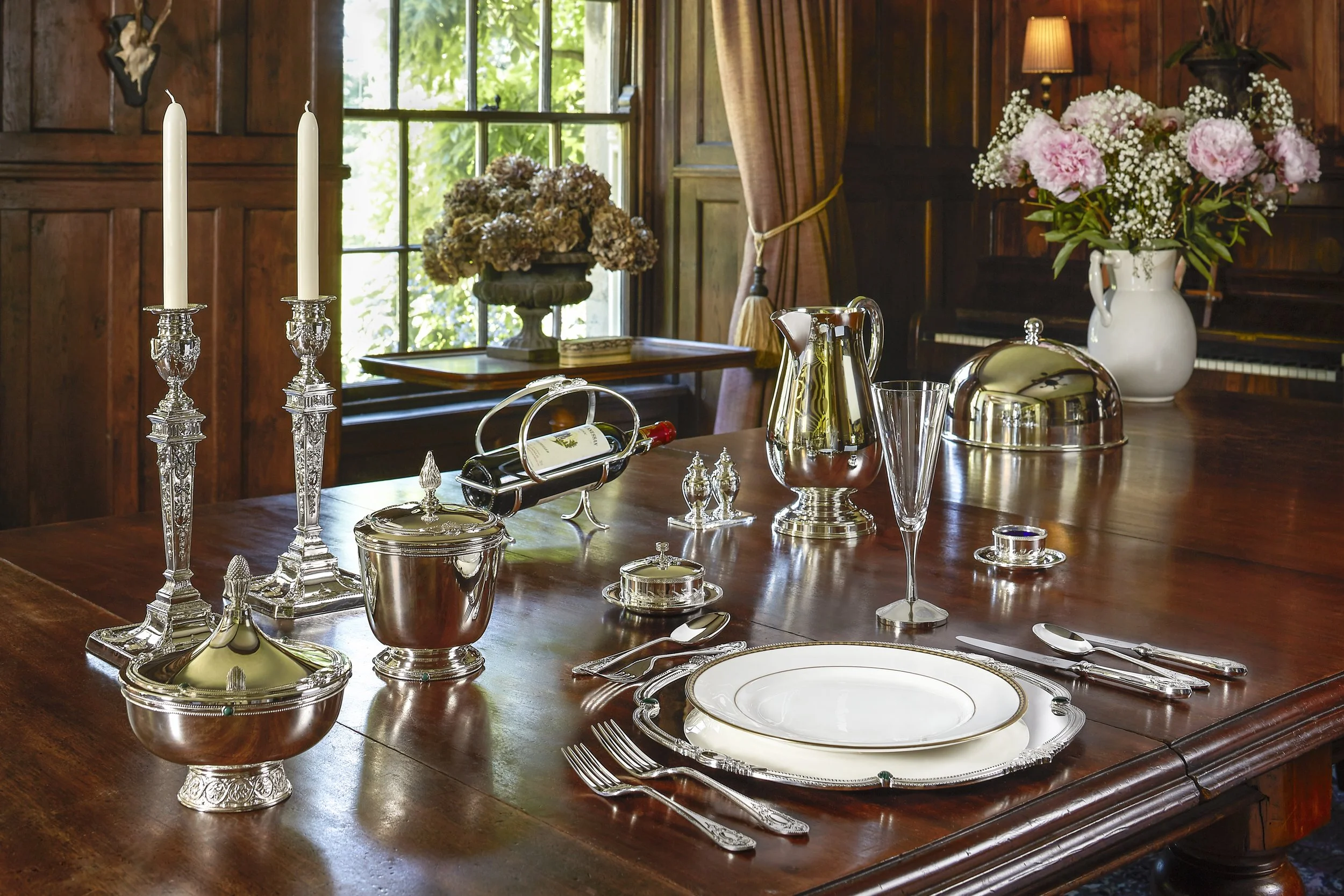 From a single statement centrepiece to a complete banqueting service, our silver is engineered to harmonise with its surroundings.